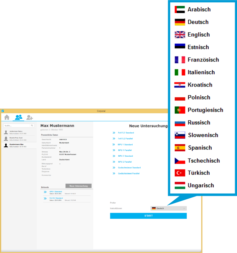 Vor jeder Untersuchung kann separat ausgewählt werden, in welcher Sprache der Test starten soll. Dies erleichtert Probanden, deren Muttersprache nicht Deutsch ist, die Bearbeitung der Testverfahren.