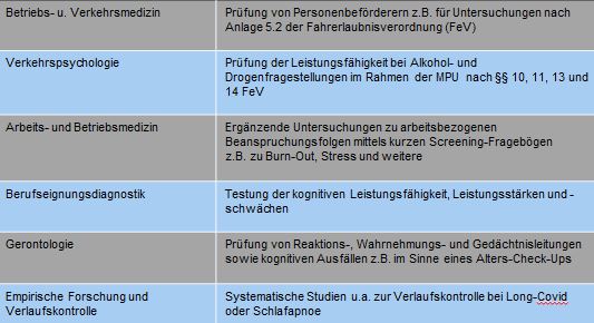 Hauptanwendungsbereich: Bereich der Verkehrspsychologie und -medizin (Fahrerlaubnisverordnung (FeV) Anlage 5.2, MPU nach § 10, 11, 13, 14 der FeV)